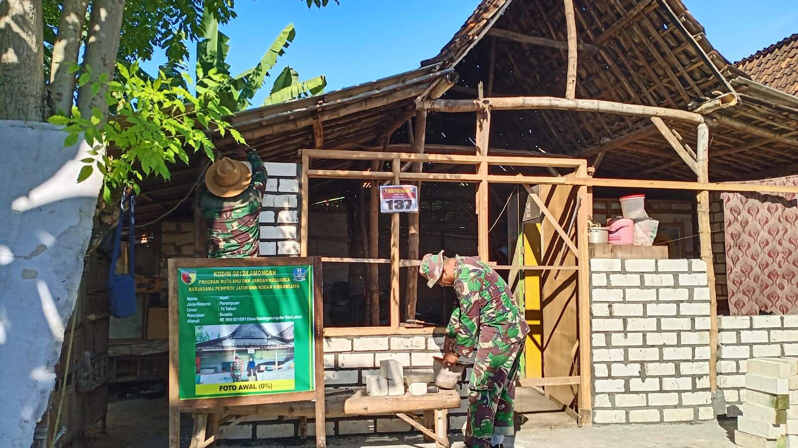 Sementara itu, Batuh Tuud Koramil 0812/19 Laren Peltu Akram saat kami konfirmasi menegaskan, wilayahnya dalam pengerjaan Rutilahu ini mendapatkan 3 unit rumah RUTILAHU dan salah satunya rumah milik Ibu Aseh (74) warga Desa Karang Wungu Kec Laren Kabupaten Lamongan yang sedang dikebut pengerjaanya oleh Koptu Safa’adin beserta masyarakat sekitarnya.