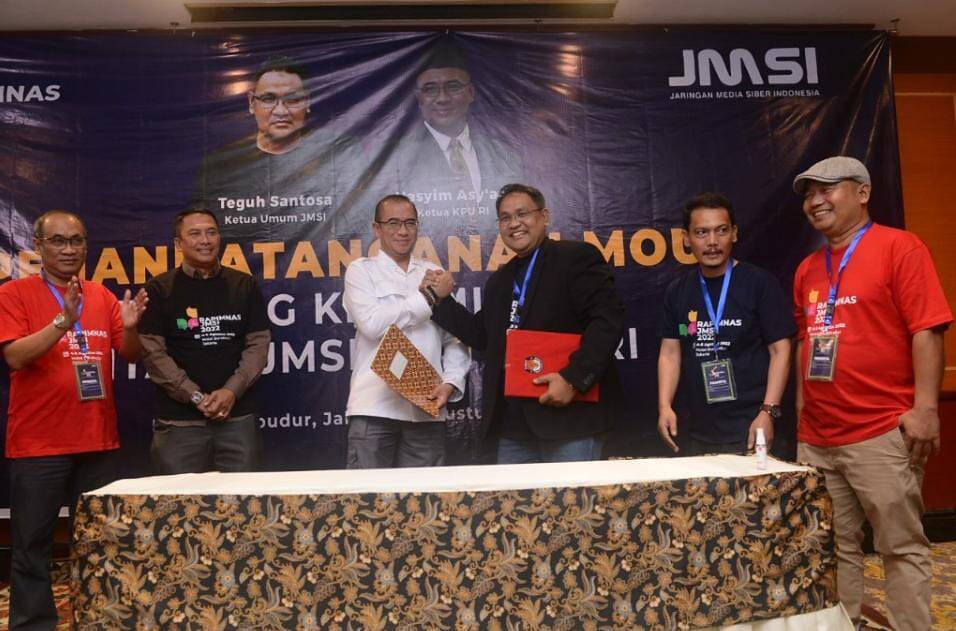 MoU ditandatangani Ketua KPU RI Hasyim Asy’ari dan Ketua Umum JMSI Teguh Santosa disaksikan Wakil Ketua Dewan Pers Agung Darmajaya, Wakil Ketua Umum JMSI Rahiman Dani, Sekretaris Jenderal JMSI Eko Pamuji, dan Sekretaris Pokja Kepemiluan JMSI Faisal Mahrawa.