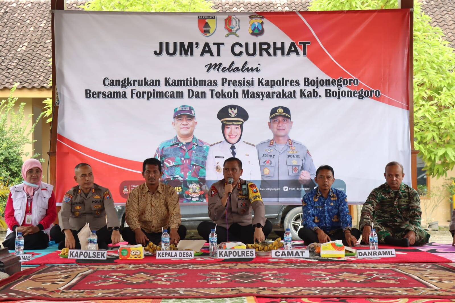 Sambutan Kapolres Bojonegoro, AKBP Rogib Triyanto mengatakan bahwa kegiatan Jum’at Curhat ini merupakan salah satu wadah untuk menampung berbagai informasi apapun berkaitan dengan keamanan, ketertiban maupun permasalahan sosial yang membutuhkan tindak lanjut oleh pihak Kepolisian serta instansi terkait sehingga tercipta situasi yang aman dan kondusif.