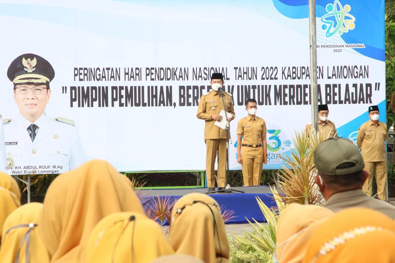 Hal tersebut disampaikan oleh Bupati Lamongan Yuhronur Efendi saat pemimpin Apel Peringatan Hari Pendidikan Nasional tahun 2022 yang bertepatan dengan masuk hari pertama pasca libur lebaran 1443 Hijriyah dan cuti bersama tahun 2022 di Halaman Kantor Pemkab Lamongan, Senin (9/5).