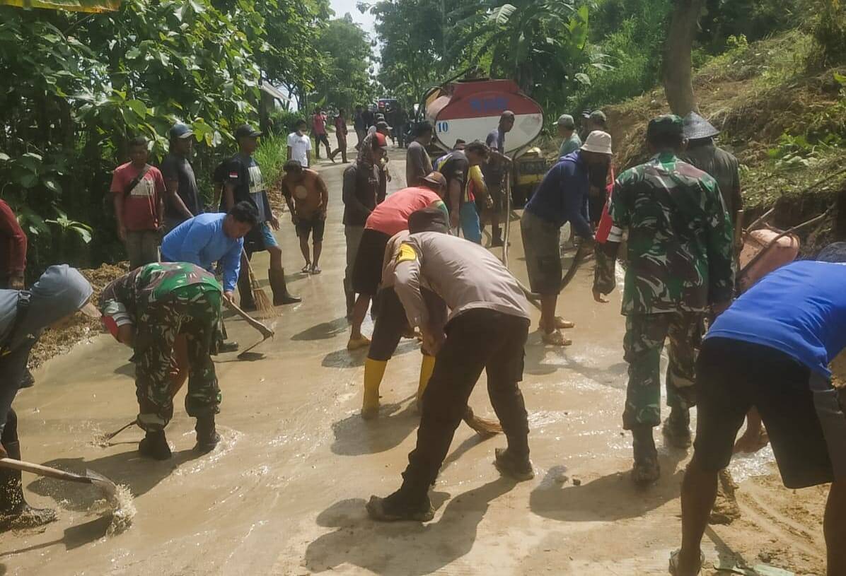 Bintara Pembina Desa (Babinsa) jajaran Koramil 23/Kedewan, Kodim 0813 Bojonegoro, pada Rabu (7/12/2022) pagi, bersama instansi terkait dan warga masyarakat melaksanakan karya bakti membersihkan longsoran tanah yang menutupi badan jalan Desa Wonocolo menuju Kedewan.
