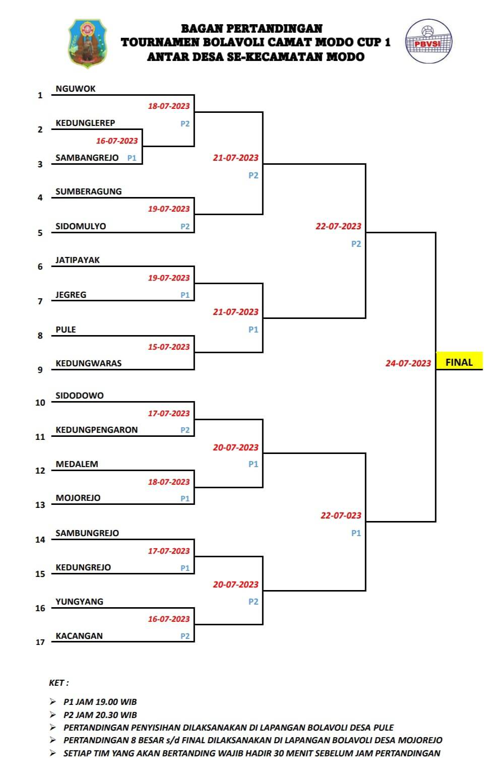 Turnamen Bola Voli Gajahmada Camat Modo Cup I 2023 yang rencana digelar di Lapangan Desa Pule mulai 15 Juli hingga selesai dan diikuti 17 Desa. Laga perdana akan bertanding tim Bola Voli Desa Pule melawan Tim Bola Voli Desa Kedungwaras pada Sabtu (15/7), pukul 19.00 WIB.