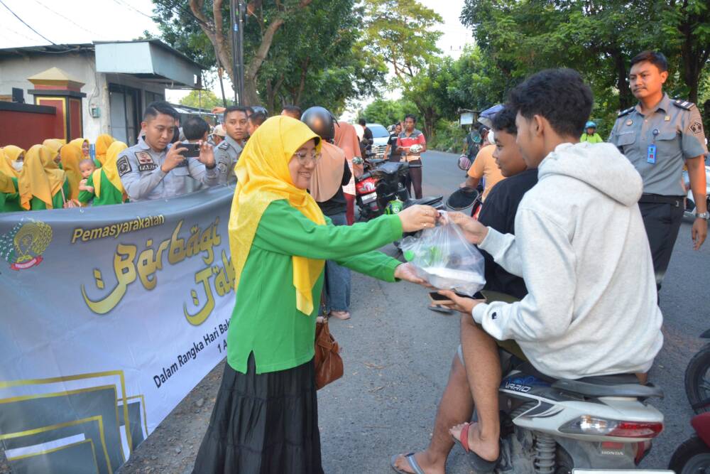 Pembagian takjil jajaran Petugas Bersama Paguyuban Ibu-Ibu Pemasyarakatan (PIPAS) di Jalan Sumargo, tepatnya di depan Lapas Kelas IIB Lamongan dan dibagikan kepada pengguna jalan yang melintas.