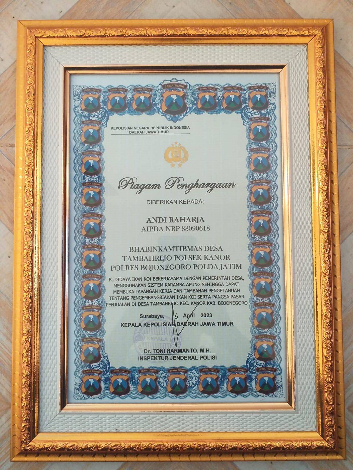 Salah satunya, Bripka Andi Raharja, Bhabinkamtibmas Polsek Kanor Polres Bojonegoro Desa Tambahrejo menerima penghargaan dari Kapolda Jatim sebagai Babinkamtibmas inovatif dalam hal pengembangan budidaya ikan koi dan membuka lapangan pekerjaan.