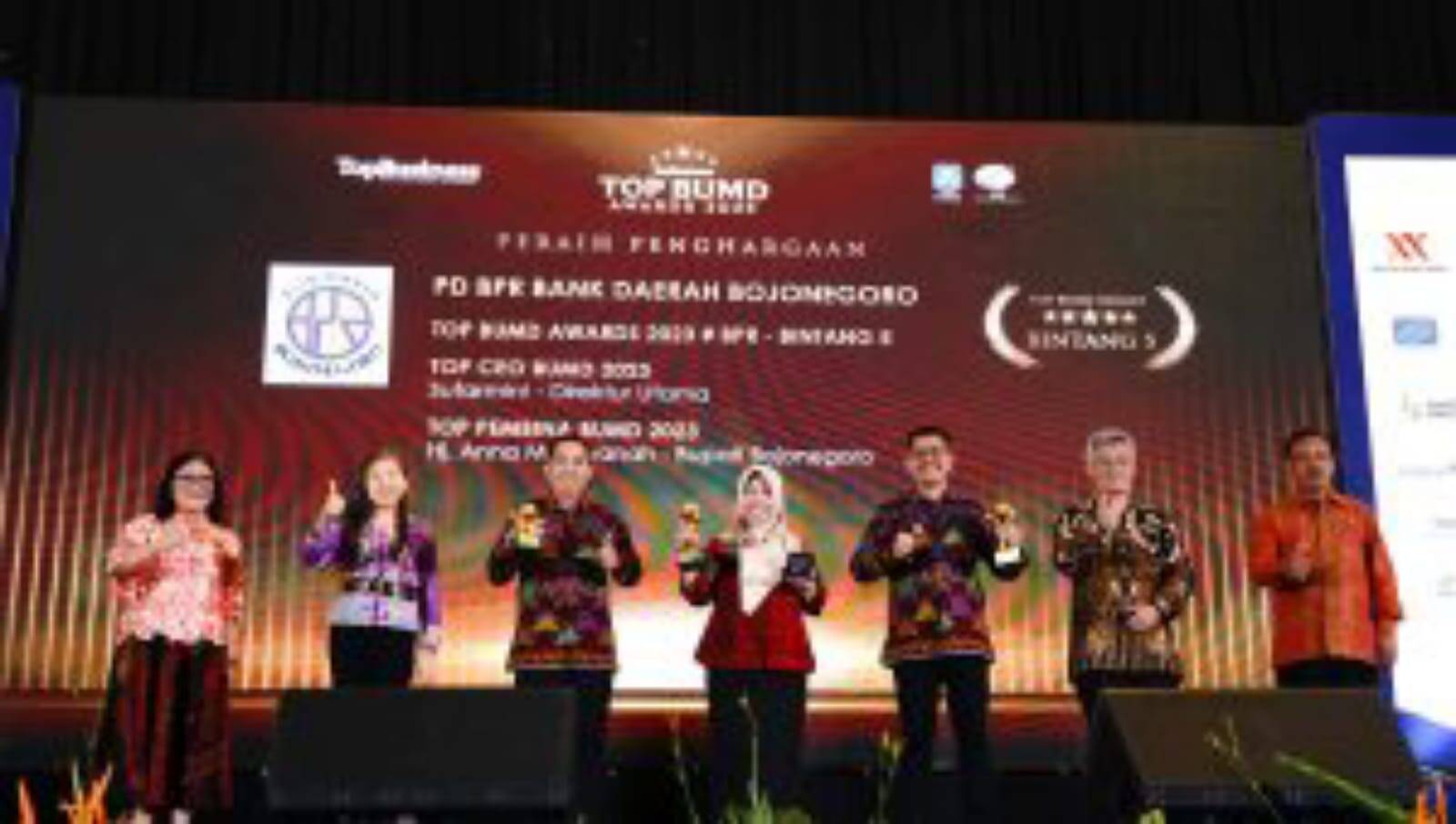 Sutarmini Direktur Utama PD BPR Bank Daerah Bojonegoro menjelaskan bahwa pendampingan dan dukungan yang diterima dari Bupati Bojonegoro berdampak besar bagi perkembangan PD BPR Bank Daerah Bojonegoro. Sehingga tahun ini Bank BPR dapat memperoleh penghargaan kategori TOP BUMD Awards 2023 dengan predikat Bintang 5 (ekselen/luar biasa) dan perolehan TOP CEO BUMD 2023.