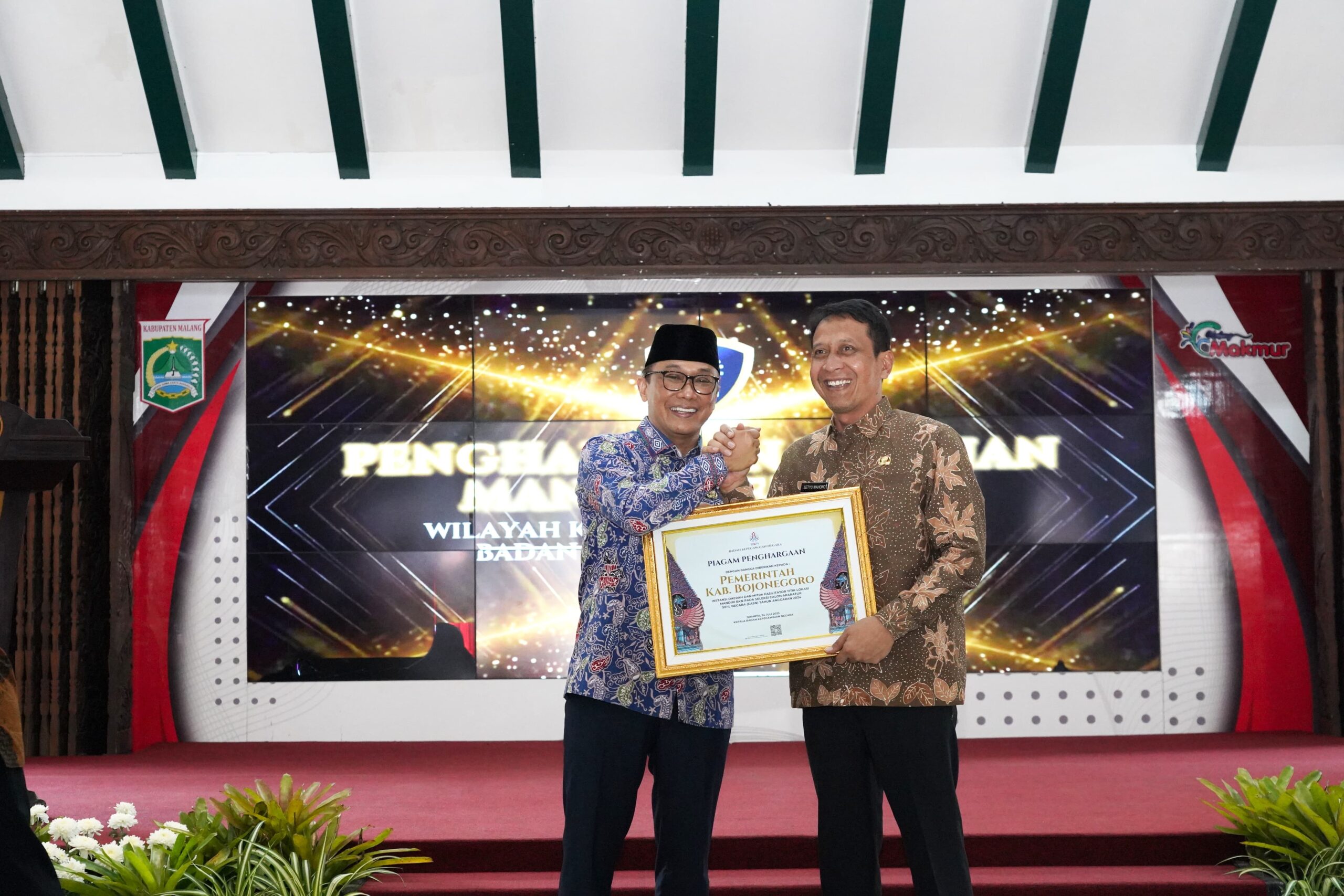Malang, Kabar1News.com — Pemerintah Kabupaten Bojonegoro kembali menorehkan prestasi membanggakan di tingkat nasional. Bupati Bojonegoro, Setyo Wahono, menerima Piagam Penghargaan dari Badan Kepegawaian Negara Republik Indonesia (BKN RI) atas keberhasilannya sebagai Instansi Daerah dan Mitra Fasilitator Titik Lokasi Mandiri BKN dalam pelaksanaan Seleksi Calon Aparatur Sipil Negara (CASN) Tahun Anggaran 2024.