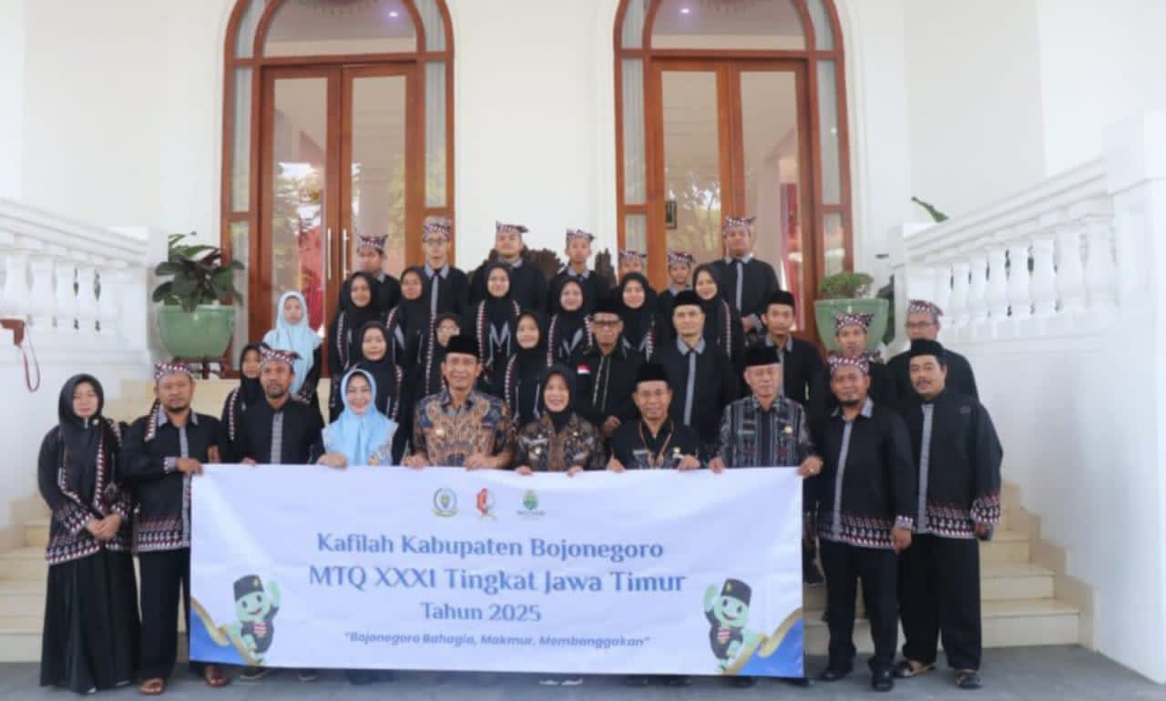 BOJONEGORO, Kabar1News.com – Suasana penuh semangat menyelimuti Pendopo Malowopati, Jumat (12/9/2025), ketika Bupati Bojonegoro, Setyo Wahono, didampingi Ketua LPTQ (Lembaga Pengembangan Tilawatil Qur’an) Kabupaten Bojonegoro yang juga Wakil Bupati, Nurul Azizah, secara resmi memberangkatkan 23 kafilah terbaik Bojonegoro untuk mengikuti ajang bergengsi Musabaqah Tilawatil Qur’an (MTQ) XXXI tingkat Provinsi Jawa Timur yang digelar di Kabupaten Jember pada 12–19 September 2025.