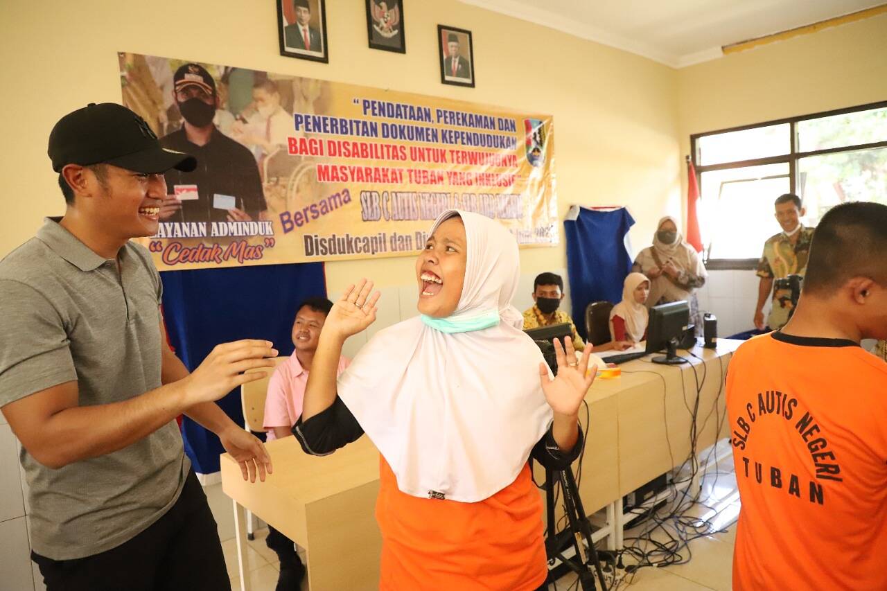 Tuban, Kabar1News.com | Bupati Tuban, Aditya Halindra Faridzky, SE., mengunjungi SLB C Autis Negeri Tuban dan SLB ABD Negeri Tuban yang berlokasi di Jalan Dr. Wahidin Sudirohusodo, Jumat (24/06/2022). Kunjungan Bupati Tuban kali ini dalam rangka meninjau proses pendataan dan penerbitan Kartu Identitas Anak (KIA) bagi siswa dan perekaman KTP bagi siswa SLB yang berusia 17 tahun. Tampak hadir pula Kepala Disdukcapil Tuban, Rohman Ubaid, Kepala Dinsos P3A dan Pemdes, Eko Julianto, dan Plt. Kepala Dispendik Tuban, Abdul Rakhmat.