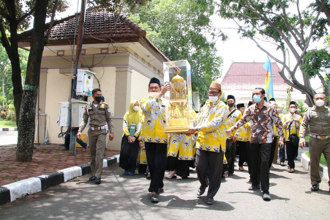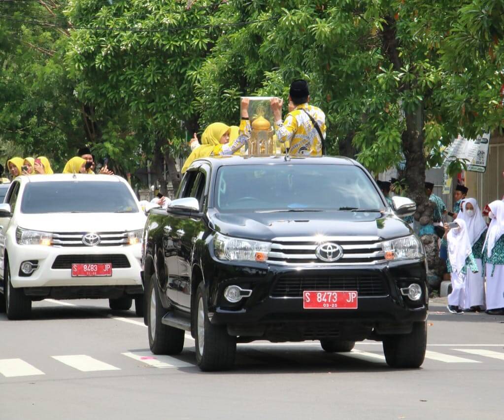 Lamongan, kabar1news.com – Pemerintah Kabupaten Lamongan menyambut meriah kedatangan para pahlawan-pahlawan Musabaqoh Tilawatil Qur’an (MTQ) yang berhasil mengukir prestasi membanggakan pada ajang MTQ Ke-29 tingkat Jawa Timur di Kantor Kementrian Agama Lamongan, sebelum melakukan perjalanan kirab menuju acara seremonial di Pendapa Lokatantra, Rabu (11/11).