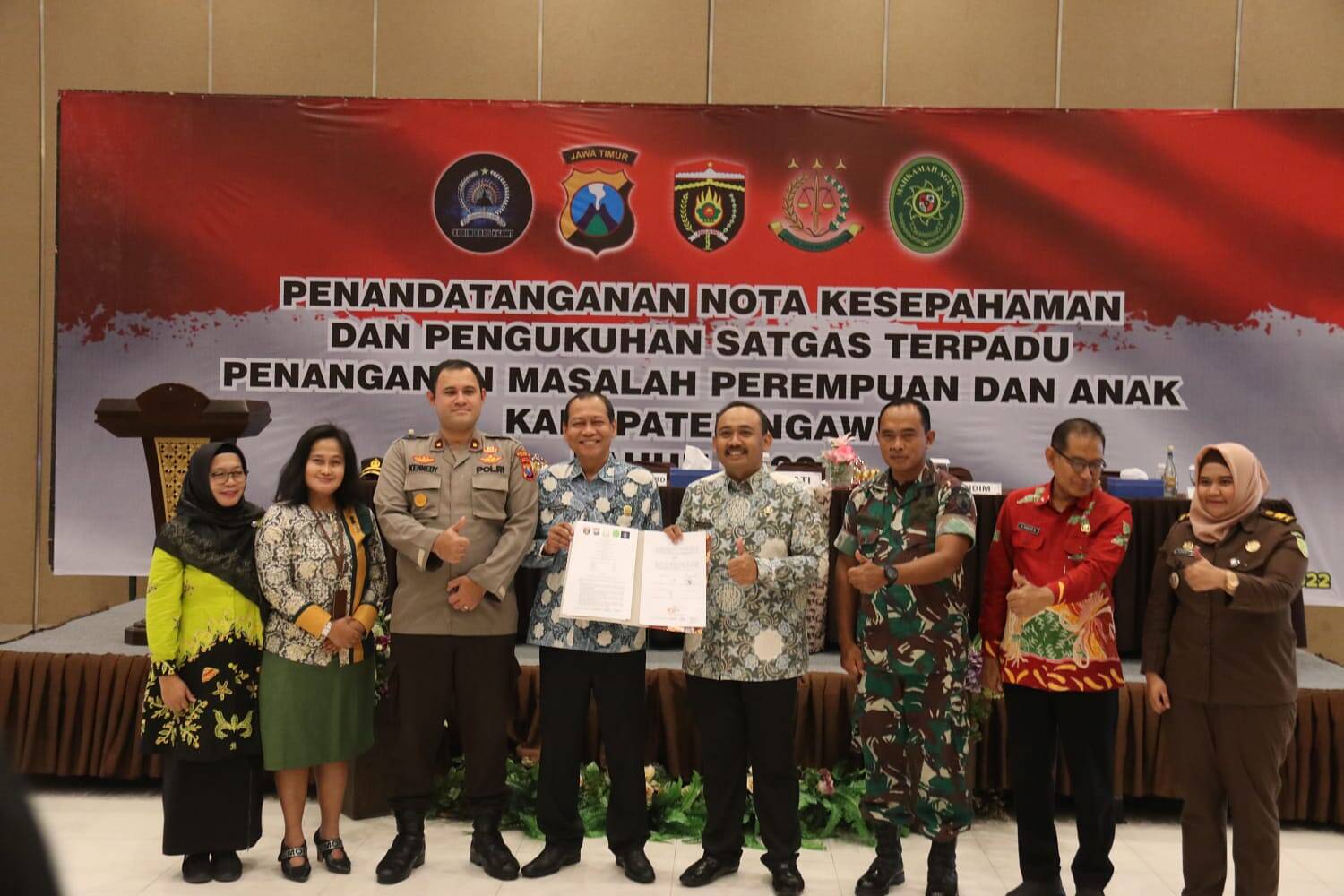 Forkopimda kabupaten Ngawi bersama dengan dinas PPPA Ngawi telah melaksanakan penandatanganan nota kesepahaman MOU dan pengukuhan satgas terpadu penanganan masalah perempuan dan anak kabupaten Ngawi bertempat di gedung Kurnia convention hall Jl.Ir Sukarno ( ring road Barat) Desa Beran, Kec/Kab. Ngawi. Kamis (20/10/2022).
