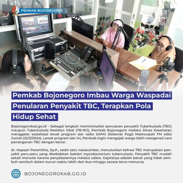 Bojonegoro, Kabar1News.com – Sebagai langkah meminimalisir penularan penyakit Tuberkulosis (TBC) maupun Tuberkulosis Resistan Obat (TB-RO), Pemkab Bojonegoro melalui Dinas Kesehatan menggelar sosialisasi lewat program siar radio SAPA! (Selamat Pagi) Malowopati FM edisi Jumat (22/3/2024). Lewat program siar ini, Pemkab ingin mengajak warga lebih mengenali cara penanganan TBC dengan benar.