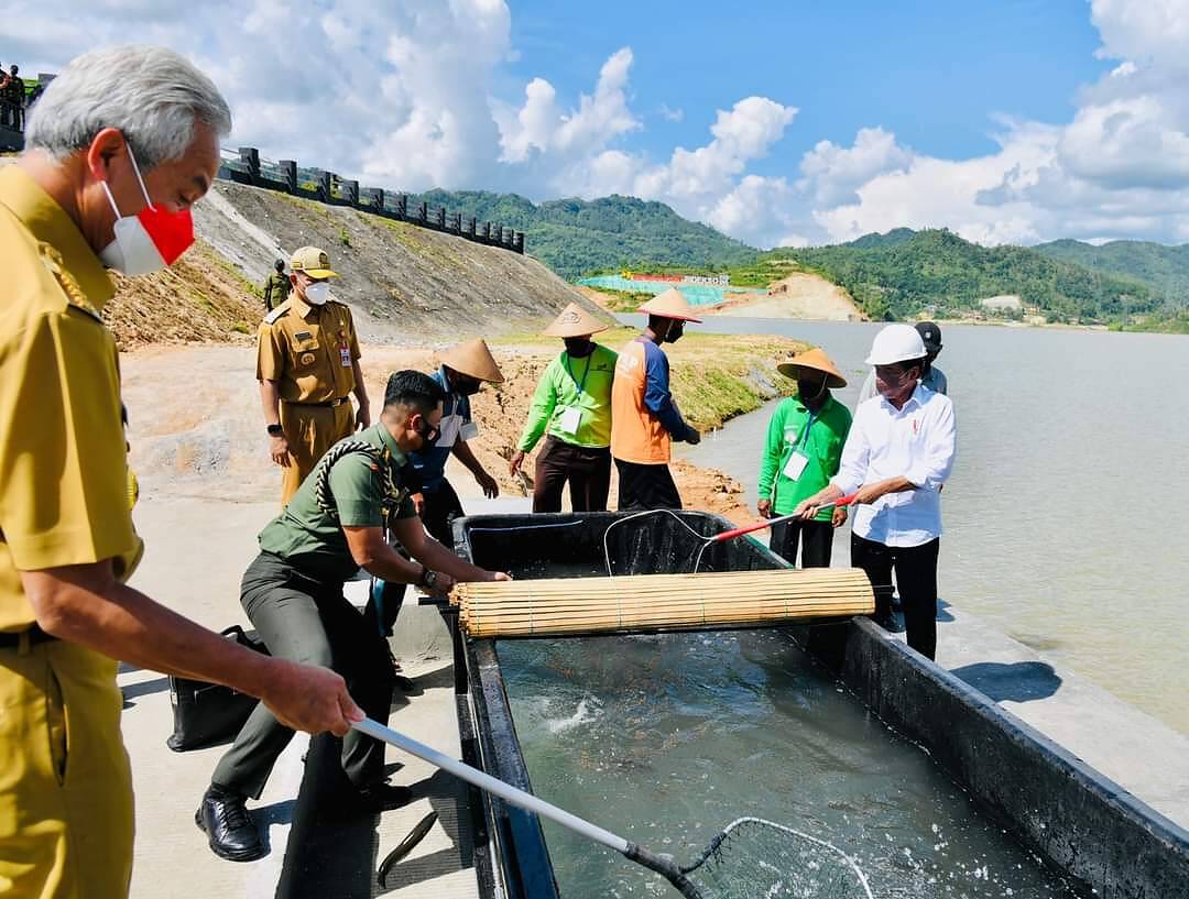 Menggunakan helikopter, Jokowi, Ganjar dan rombongan terbang dari Bandara Adi Soemarmo Solo dan tiba di lokasi bendungan sekitar pukul 13.45 WIB. Setibanya di lokasi, Jokowi dan Ganjar langsung melakukan peresmian, berupa penandatanganan prasasti dan tebar ikan ke lokasi bendungan. Setelah itu, Jokowi dan Ganjar bersama rombongan ngobrol dengan perwakilan masyarakat sambil makan durian.