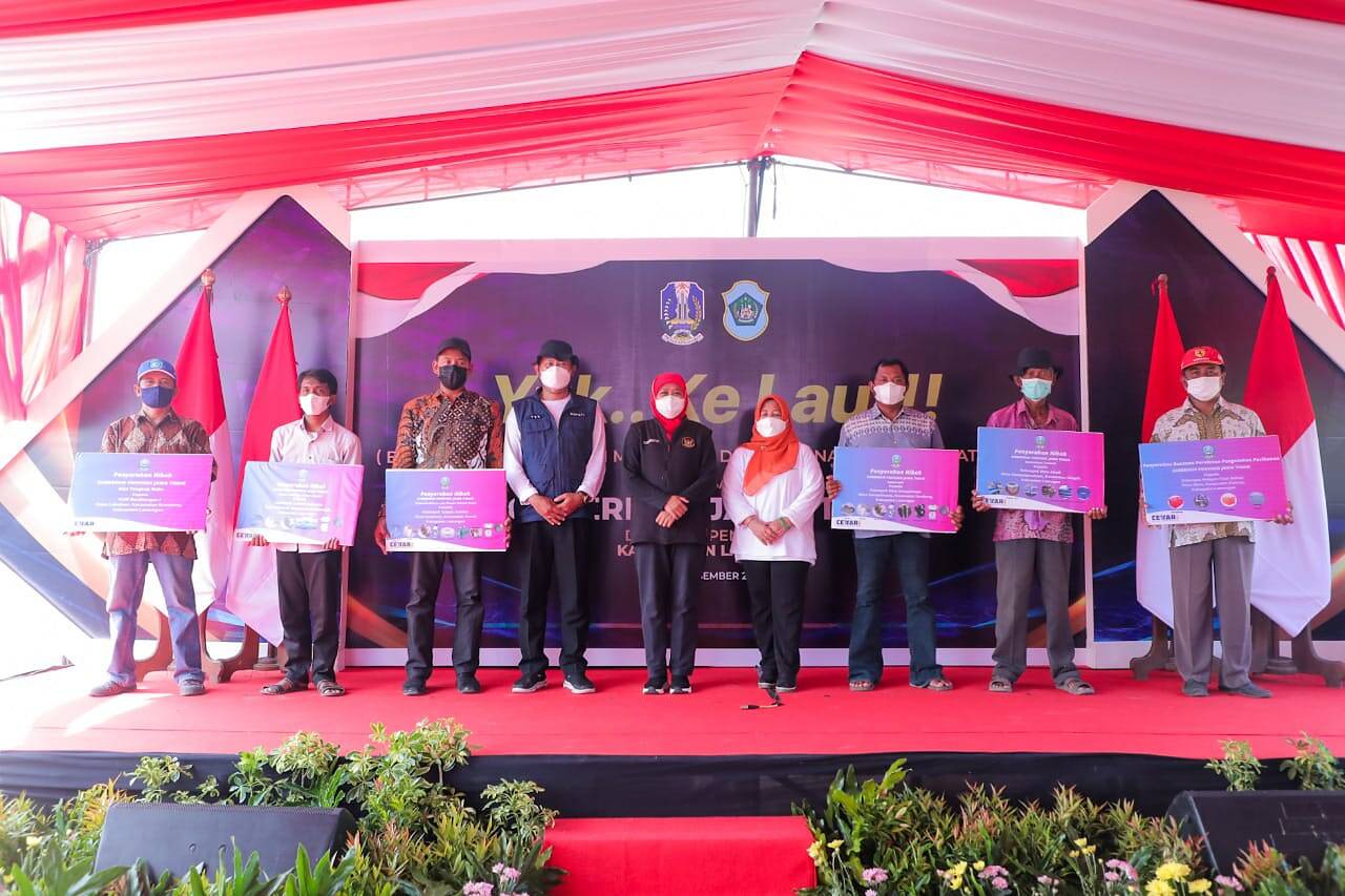 Lamongan, kabar1news.com – Sebagai puncak peringatan Hari Ikan Nasional (Harkannas) Ke-8 tahun 2021 yang diselenggarakan Pemprov Jawa Timur di Kabupaten Lamongan, Bupati Lamongan Yuhronur Efendi mendampingi Gubernur Jawa Timur Khofifah Indar Parawansa melakukan tabur benih ikan diperairan Lamongan tepatnya di Dewi Cemara (Desa Wisata Cerdas, Mandiri dan Sejahtera) Pantai Pengkolan Desa Kandangsemangkon Kecamatan Paciran, Minggu (12/12) sebagai upaya restorasi sumber daya laut berkelanjutan.