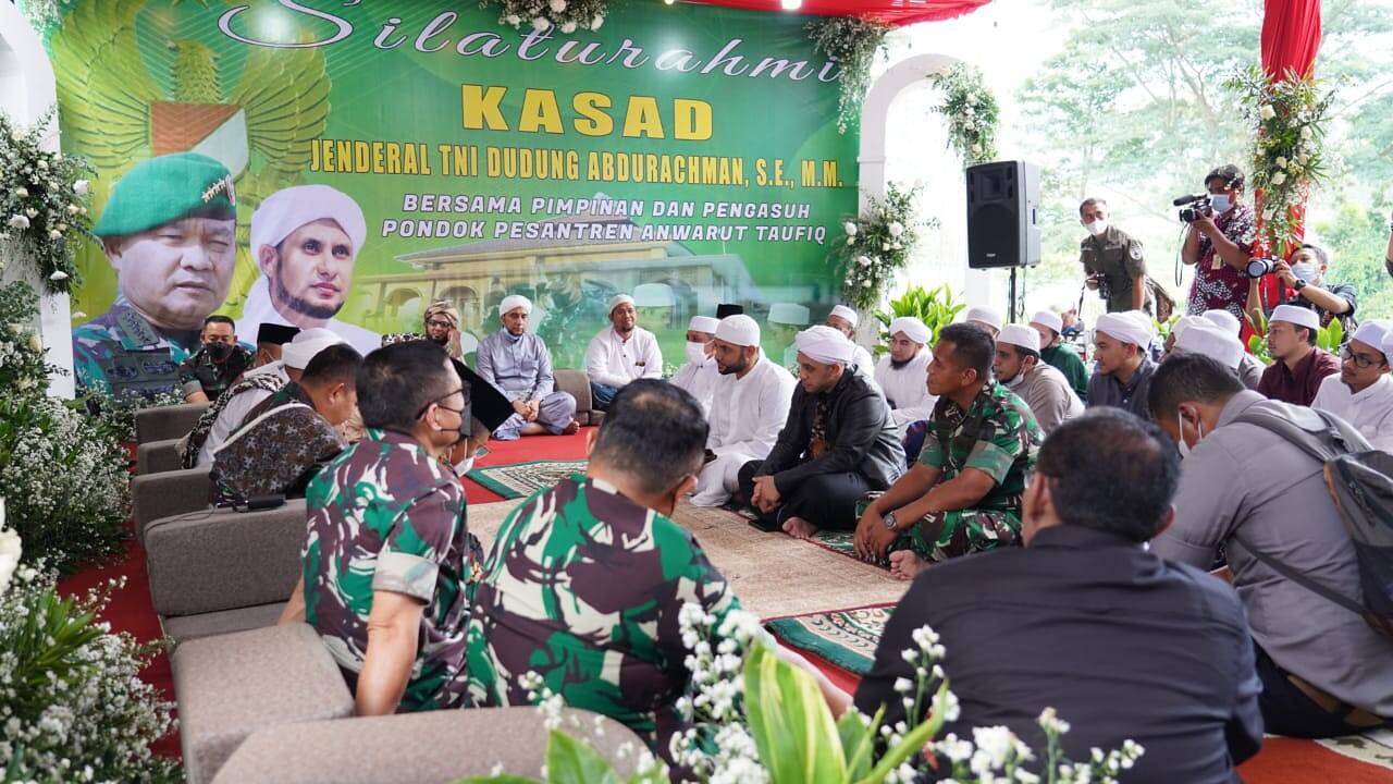 Malang, kabar1news.com – Kepala Staf Angkatan Darat (Kasad) Jenderal TNI Dudung Abdurachman, S.E., M.M., dalam rangkaian kunjungan kerjanya di wilayah Kodam V/Brawijaya melakukan Silaturahmi ke beberapa pondok pesantren, dalam kunjungannya Kasad disambut pimpinan Pondok Pesantren Anwarut Taufiq Malang dan Yayasan Pondok Pesantren Darullughah Wadda’wah, Pasuruan, Kamis (3/2/2022).