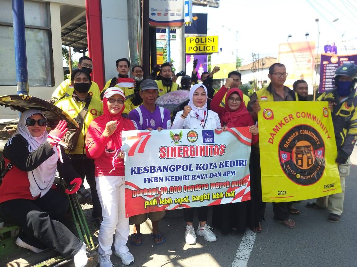 ” Hari ini puluhan gabungan Kesbangpol Kota Kediri, JMP, FKBN dan driver ojek online Maxim Kediri berbagi ribuan bendera merah putih di 3 lokasi yakni di Lampu merah Rumah sakit Baptis, Alun-alun Kota Kediri dan Barat Sungai. Alhamdulilah acara berjalan lancar.” ucap Vazmico Ginataka. (*/Kris)