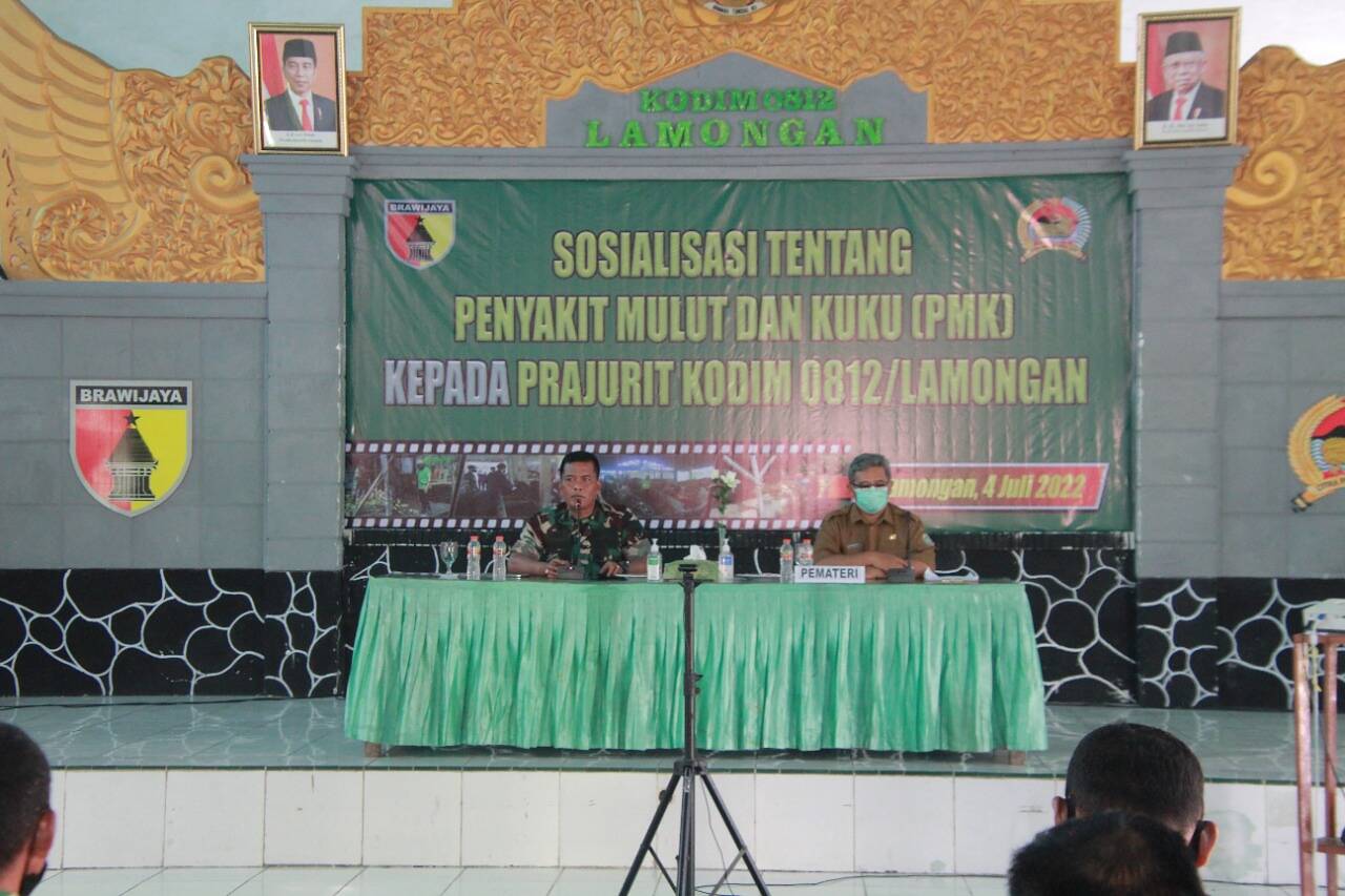 Seperti halnya Anggota TNI jajaran Kodim 0812 Lamongan yang mendapatkan sosialisasi terkait penanganan Penyakit Mulut dan Kuku (PMK) yang diberikan Dinas Peternakan kab Lamongan Drh Rahendra, P.E.S dengan didampingi Kepala Staf Kodim 0812 Lamongan Mayor Arh. GN. Putu Ardana, S.S Di Aula Kadet Soewoko Kodim 0812/Lamongan secara daring, yang diikuti 400 orang. Senin (04/072022)