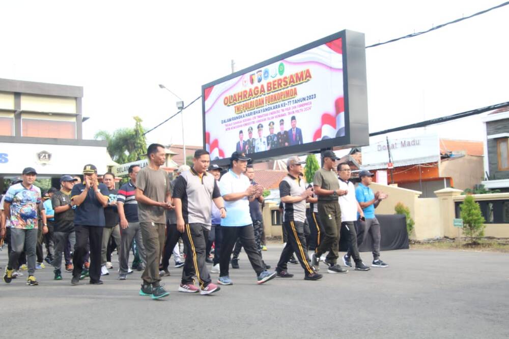 Lamongan, Kabar1news.com – Wujud Sinergitas TNI – POLRI dan Pemerintah Daerah melalui olahraga bersama dalam rangka memperingati Hari Bhayangkara ke – 77 yang diselenggarakan oleh Polres Lamongan di lapangan Mapolres, Jumat (19/05/2023).