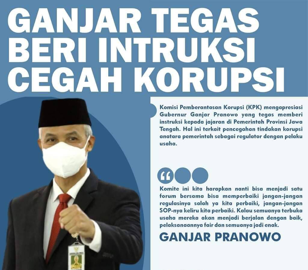 SEMARANG, kabar1news.com – Komisi Pemberantasan Korupsi (KPK) mengapresiasi Gubernur Ganjar Pranowo yang tegas memberi instruksi kepada jajaran di Pemerintah Provinsi Jawa Tengah. Hal ini terkait pencegahan tindakan korupsi anatara pemerintah sebagai regulator dengan pelaku usaha.