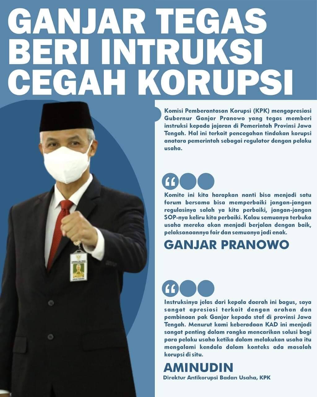 Hal itu disampaikan Direktur Antikorupsi Badan Usaha Aminudin saat audiensi Komite Advokasi Daerah (KAD) bersama Gubernur Ganjar Pranowo di Ruang Rapat Kantor Pemprov Jateng, Selasa (5/4). Aminudin menyebut Ganjar satu-satunya kepala daerah yang berani tegas menginstruksikan jajarannya terkait korupsi.
