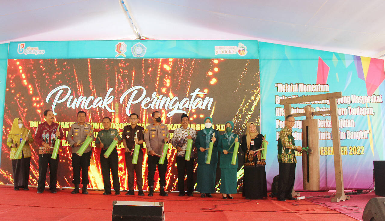 Pemerintah Kabupaten Bojonegoro menggelar puncak peringatan Bulan Bhakti Gotong Royong Masyarakat (BBGRM) XIX dan Hari Kesatuan Gerak (HKG) PKK Ke-50 Kabupaten Bojonegoro Tahun 2022. Kegiatan dengan tema 'Melalui Momentum BBGRM, Kita Wujudkan Bojonegoro Terdepan Pembangunan Berkelanjutan Mendukung Optimis Jatim Bangkit' dilaksanakan di Lapangan Desa Jatigede Kecamatan Sumberrejo, Kamis (8/12/2022).