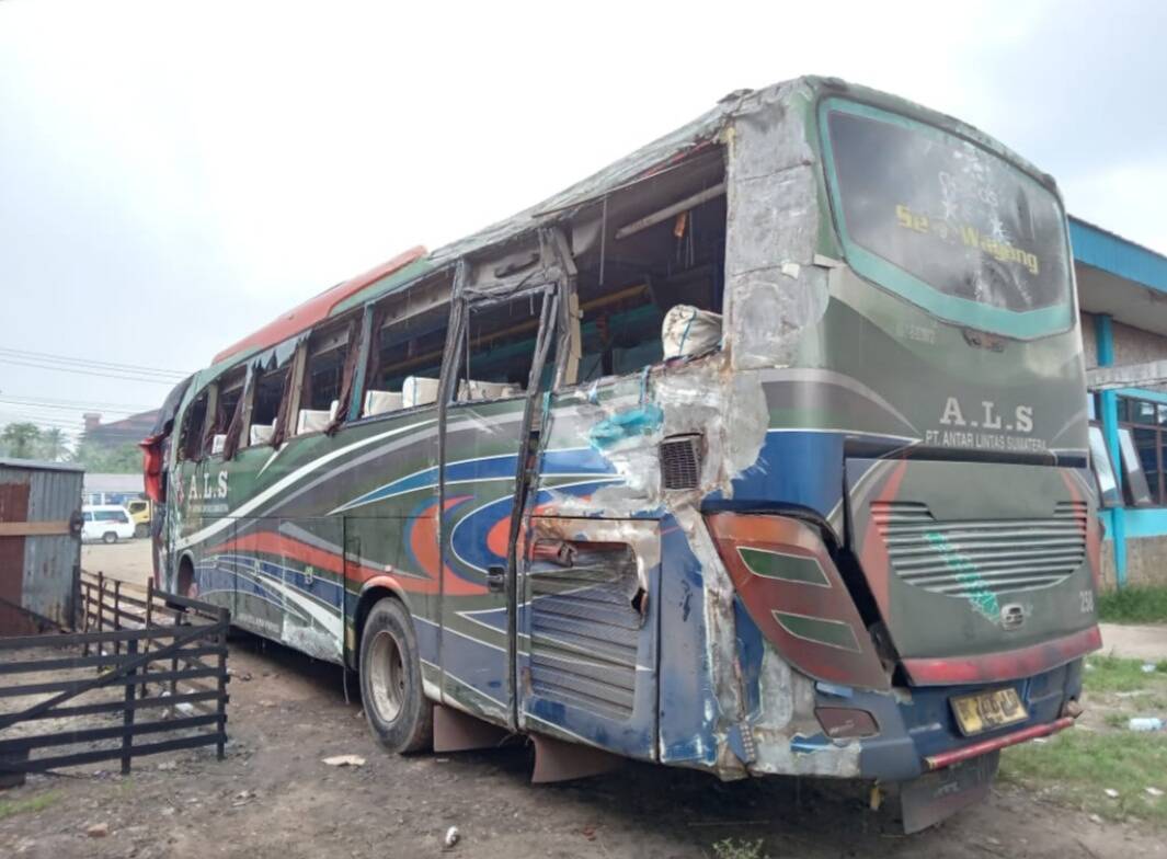 Ket. Gambar: Kondisi Mobil Bus ALS setelah di evakuasi ke Loket Bus ALS Padangmatinggi, Padangsidimpuan.