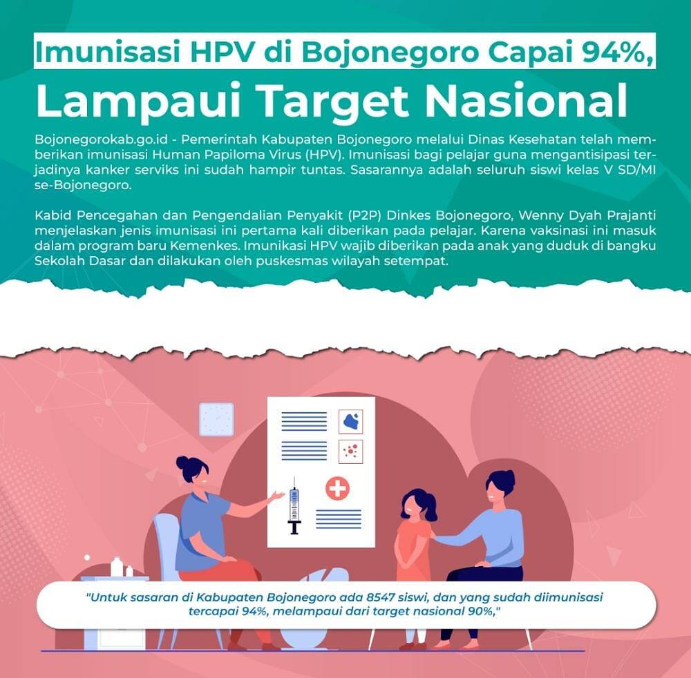 “Untuk sasaran di Kabupaten Bojonegoro ada 8.547 siswi, dan yang sudah diimunisasi tercapai 94%, melampaui dari target nasional 90%,” terangnya.