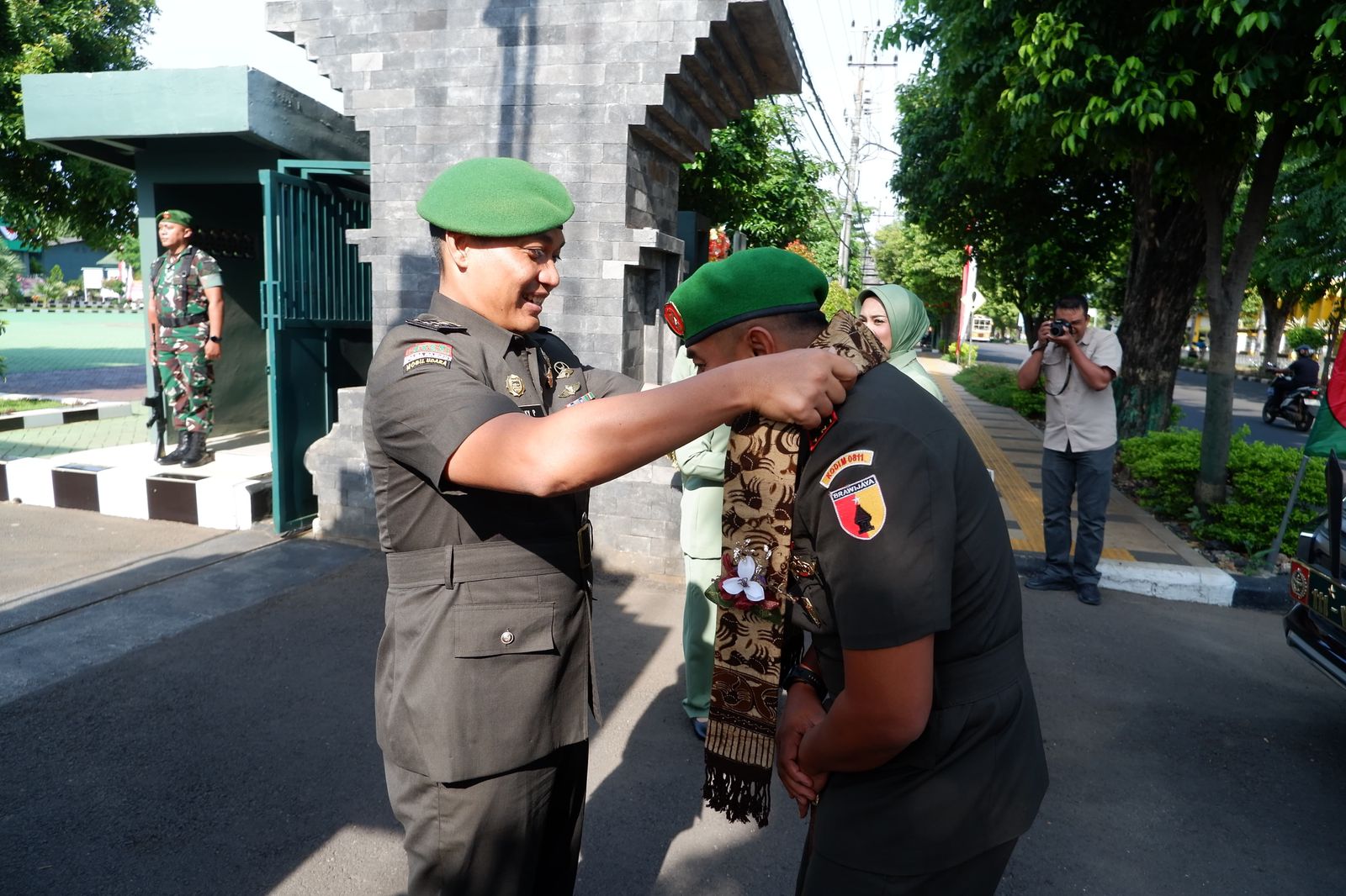 Letkol Inf Dicky Purwanto (pejabat lama) sambut kedatangan Letkol Inf Galih Sakti Pramudyo (pejabat baru), dengan mengalungkan selendang batik khas Tuban, sebagai bentuk penghormatan dari pejabat lama ke pejabat baru, di Kodim 0811 Tuban.