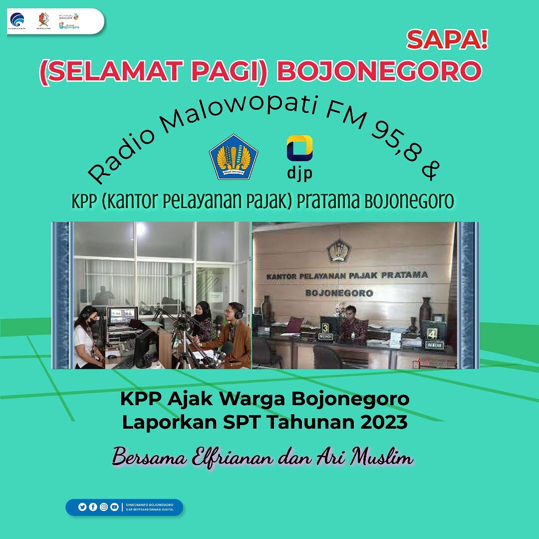 Bojonegoro, Kabar1News.com – Pemkab Bojonegoro melalui program siar Dinas Komunikasi dan Informatika, SAPA! (Selamat Pagi!) Malowopati FM edisi Jumat (30/12/2022) bersama KPP (Kantor Pelayanan Pajak) Pratama Bojonegoro mengajak masyarakat Bojonegoro untuk membuat laporan SPT tahunan 2023. Hal ini untuk mendorong masyarakat taat pajak.