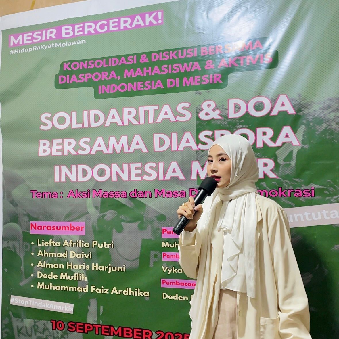 “Kami mahasiswa dan diaspora Indonesia di Mesir berdiri bersama rakyat. Kami mengecam segala bentuk kekerasan terhadap masyarakat sipil,” tegas Rifat saat ikut membacakan pernyataan sikap.