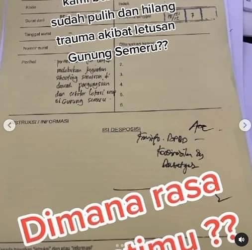 Tertulis dalam dokumen, proses syuting sinetron drama cinta di lokasi pengungsian dan lokasi erupsi Gunung Semeru ini mendapat disposisi dari BPBD yang mana isinya koordinasi saja dengan Dansatgas. (*Cp)