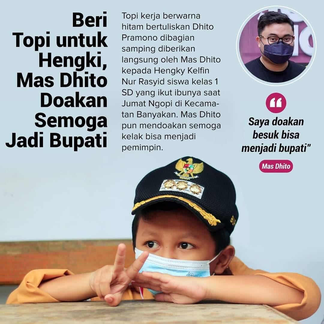 Topi hitam bertuliskan Dhito Pramono dibagian samping yang sejak awal dijanjikan untuk diberikan pun diserahkan dan diterima ibu bocah SD itu. Mas Dhito pun mendoakan kepada bocah SD itu supaya kelak bisa menjadi pemimpin.