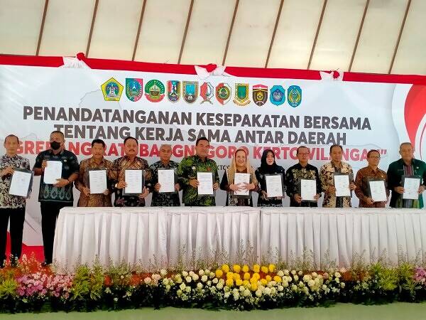 Bojonegoro, Kabar1News.com – Sebagai upaya mendukung percepatan dan akselerasi pembangunan, Pemkab Bojonegoro bersama 10 Kabupaten/Kota sekitar yang disingkat GREBANG RATUBANGNEGORO KERTOWILANGAN melaksanakan penandatanganan kesepakatan bersama tentang kerja sama daerah. Penandatangan ini dilaksanakan di Pendopo Malowopati Bojonegoro, Kamis (20/10/2022).