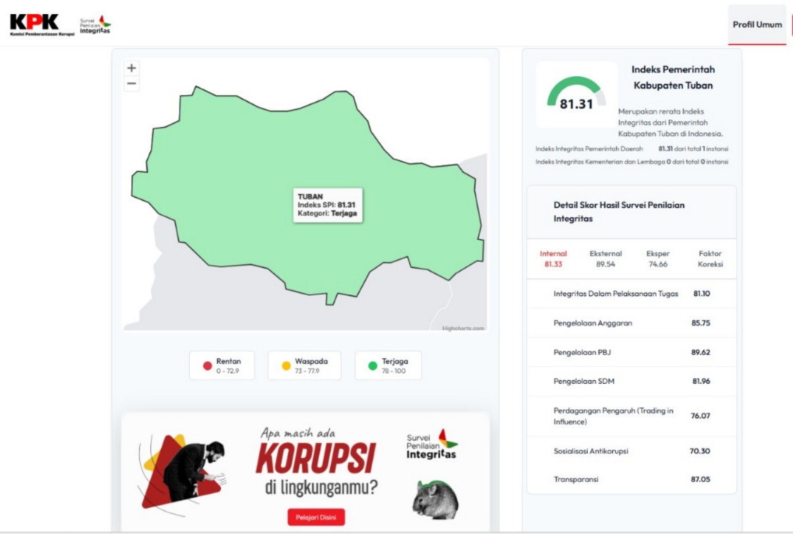 Komitmen tersebut kembali berbuah hasil manis. Pemkab Tuban meraih nilai Survei Penilaian Integritas (SPI) 2025 sebesar 81,31 dan masuk dalam kategori Terjaga. Nilai SPI Pemkab Tuban melebihi Indeks integritas nasional pada 2025 berada di angka 72,32.