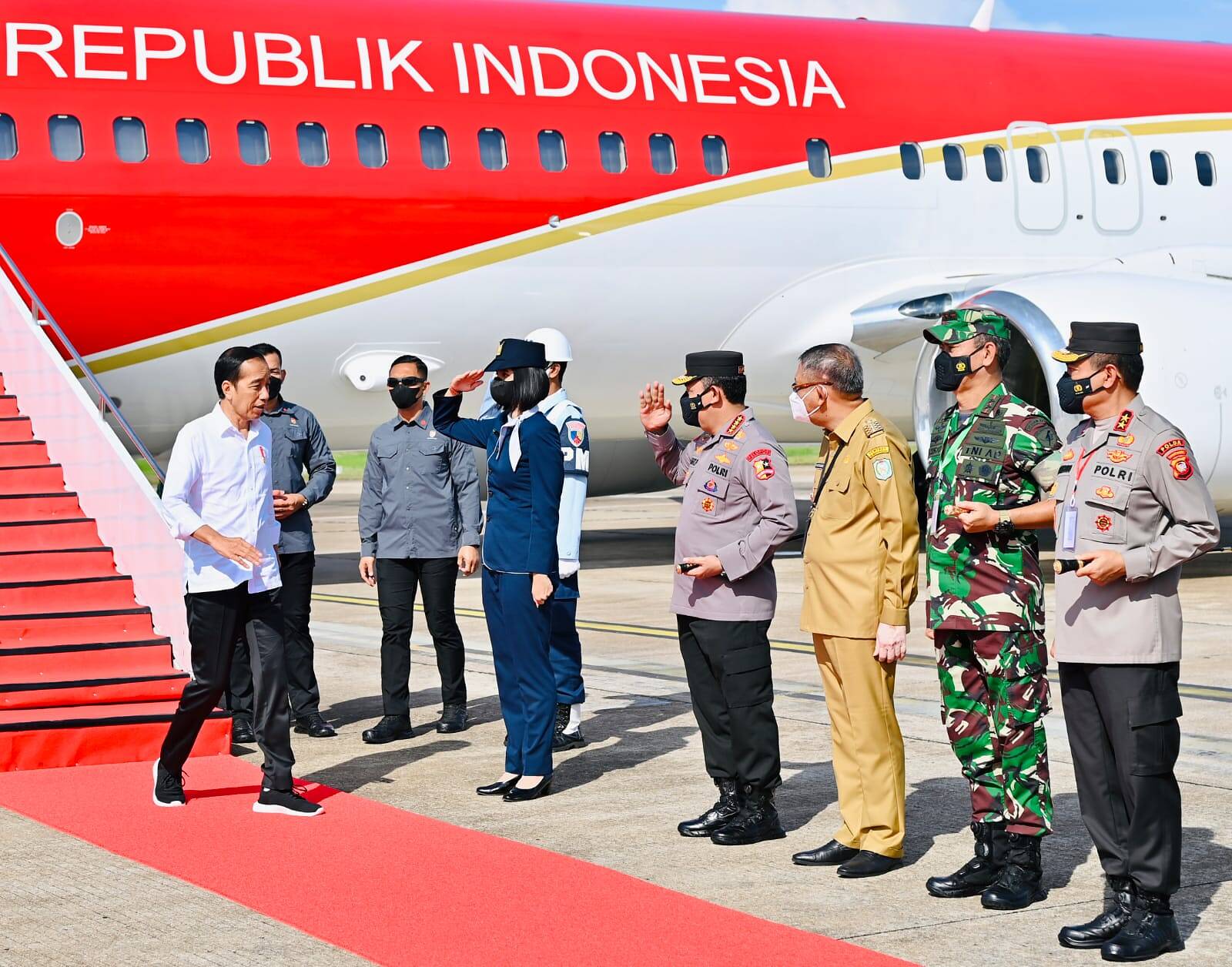 Saat tiba, Presiden disambut oleh Kapolri Jenderal Pol. Listyo Sigit Prabowo, Gubernur Kalbar, H. Sutarmidji, S.H., M.Hum., Pangdam XII/Tpr, Mayjen TNI Sulaiman Agusto, S.I.P., M.M., Kapolda Kalbar, Irjen Pol Suryanbodo Asmara dan Danlanud Supadio Marsma TNI Deni Hasoloan Simanjuntak.