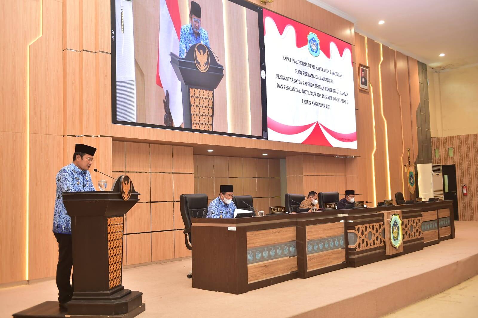 Lamongan, kabar1news.com – Rapat paripurna untuk membahas Raperda (Rancangan Peraturan Daerah) Tahap II tahun 2021, dalam rangka pengantar nota raperda usulan Pemkab (Pemerintah Kabupaten) dan raperda inisiatif DPRD digelar, Rabu (24/11), di Ruang Rapat Paripurna DPRD Lamongan.
