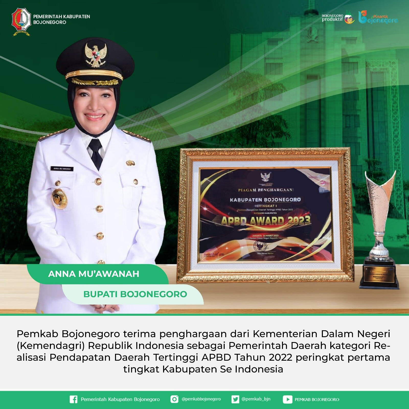 Penghargaan untuk Bojonegoro berasal dari Kementerian Dalam Negeri (Kemendagri) diterima oleh Kepala Bapenda Bojonegoro M. Ibnu Soeyoeti. Bojonegoro punya Pendapatan DaerahTertinggi APBD Tahun 2022 dan menduduki peringkat pertama tingkat Kabupaten Se Indonesia. Pada APBD 2022, capaian realisasi PD sebesar 137,28%. Sumber Data : Laporan Realisasi Anggaran Pendapatan dan Belanja Daerah Tahun 2022 dari BPKAD Kab. Bojonegoro.
