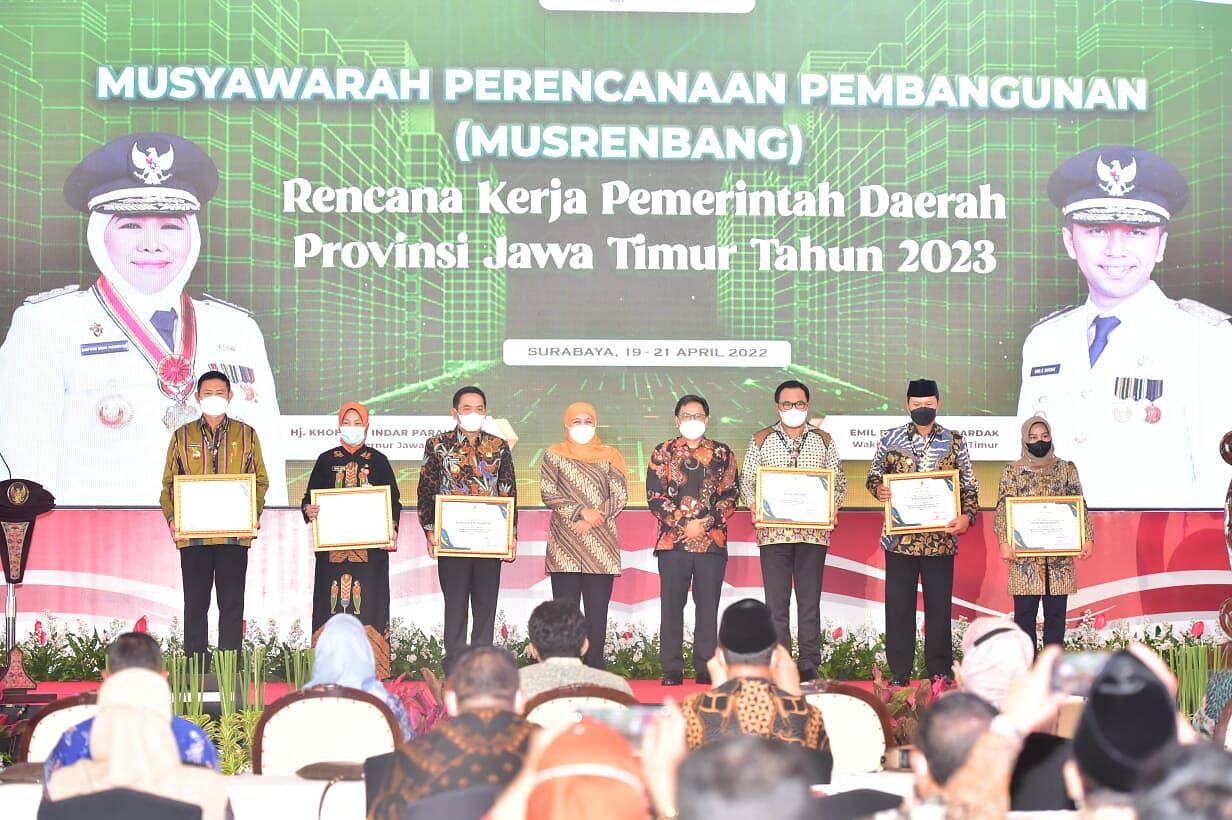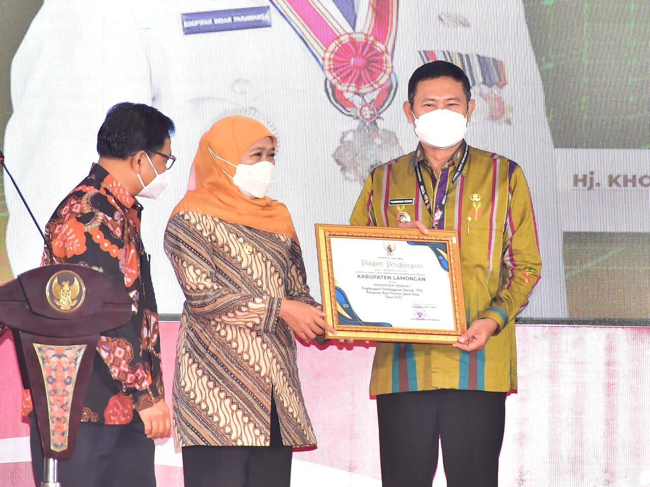 Penghargaan diserahkan langsung oleh Gubernur Jatim Khofifah Indak Parawansa kepada Bupati Lamongan Yuhronur Efendi dalam acara Musyawarah Perencanaan Pembangunan (Musrenbang) RKPD Provinsi Jawa Timur Tahun 2023 di Hall Room Sangri-La Hotel Surabaya, Selasa (19/4).