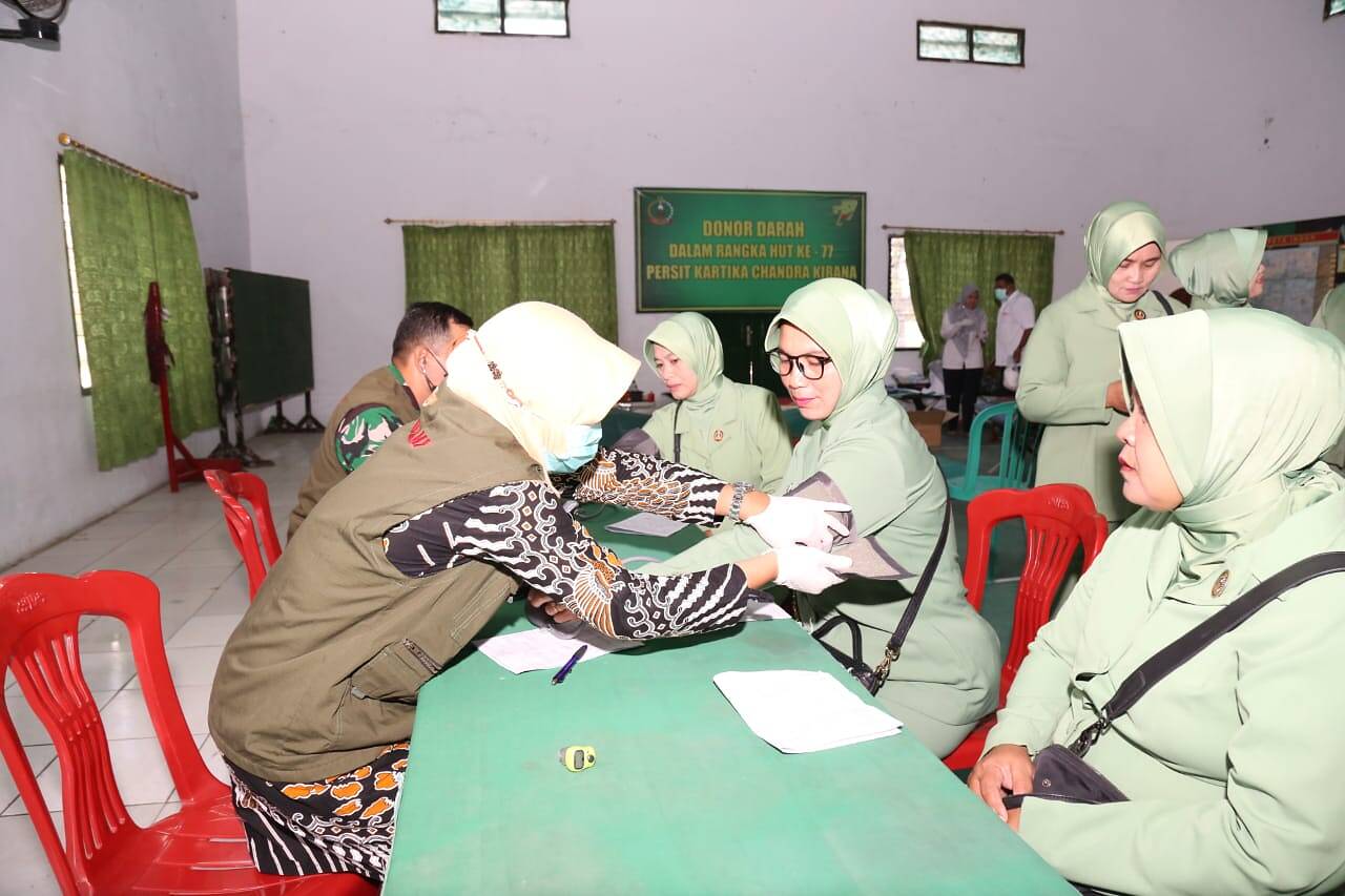 Lamongan, Kabar1news.com -Menyambut HUT Ke-77 Persit Kartika Chandra Kirana (KCK) Tahun 2023 yang jatuh pada tanggal 3 April 2023, Persit KCK Cabang XXVII Kodim 0812/Lamongan menggelar bakti sosial donor darah di Aula Kadet Soewoko Kodim 0812/Lamongan Jalan Panglima Sudirman Nomor 113 Lamongan, Jawa Timur, Senin (13/03/2023).
