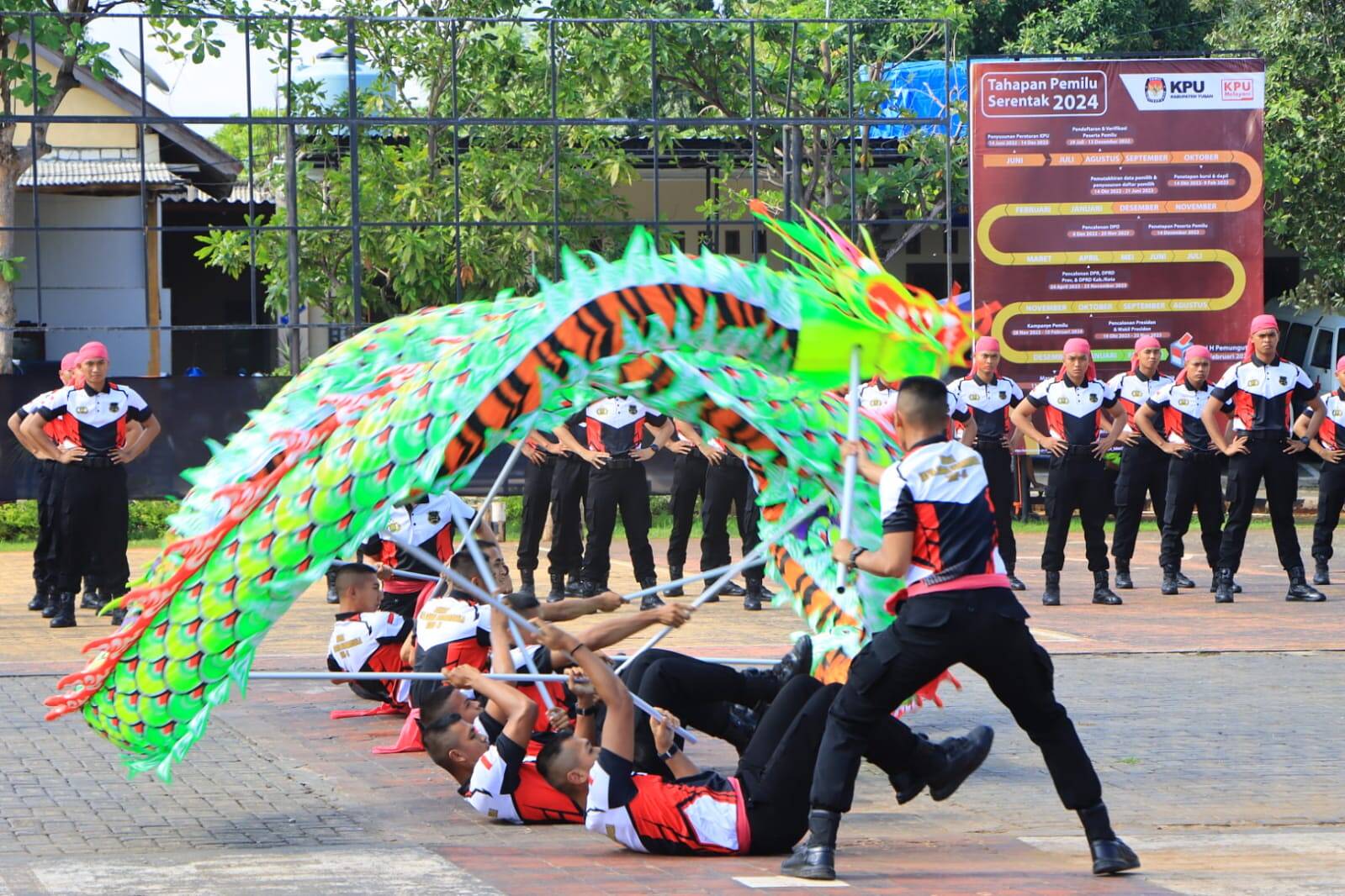 Usai pelaksanaan upacara penutupan latihan kerja, kegiatan ditutup dengan peragaan beladiri Polri dilanjutkan tari naga Liang Liong oleh Siswa SPN Polda Jawa timur peserta Latihan kerja serta Barongsai.