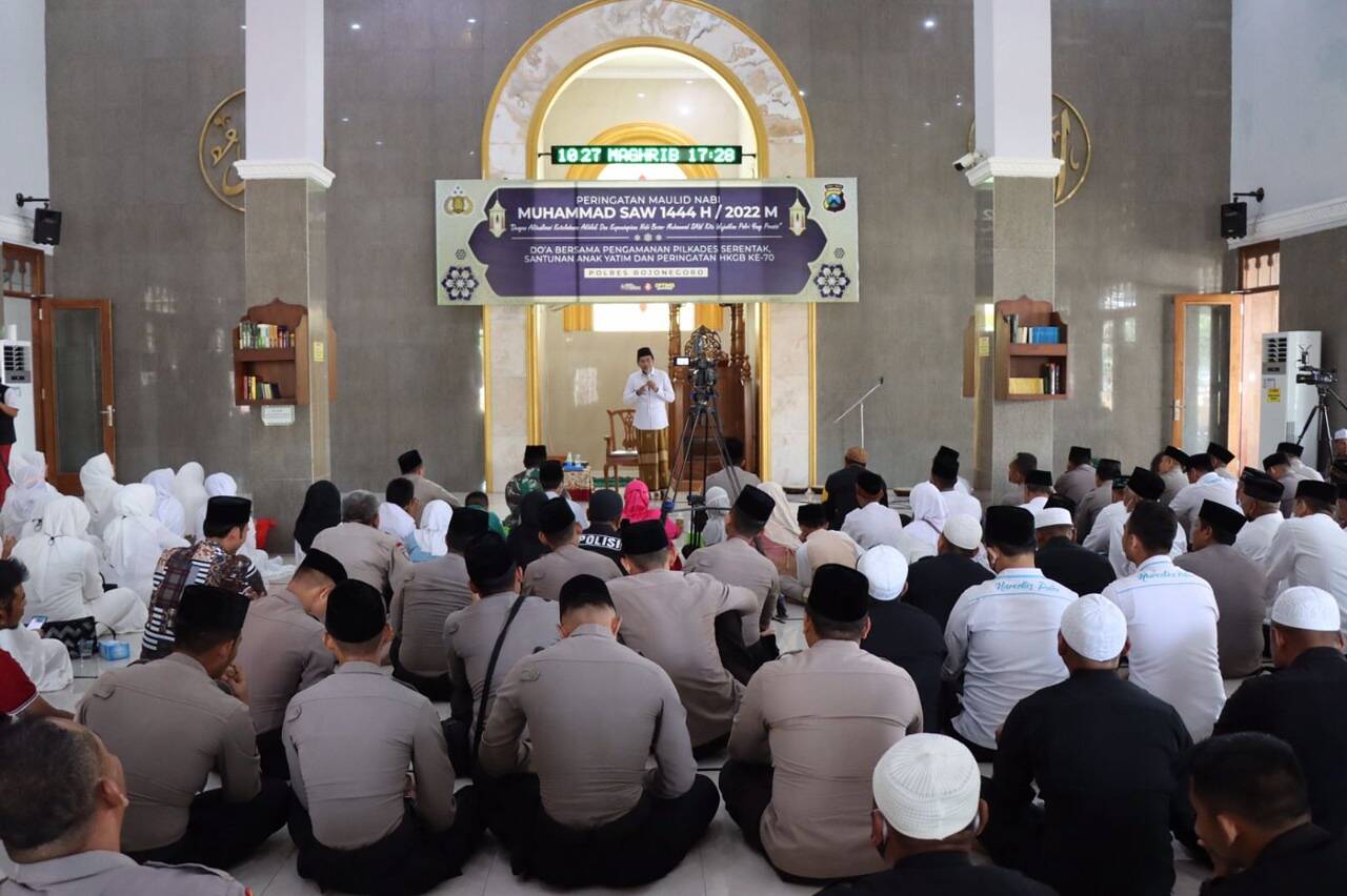 “Hari ini kita melaksanakan kegiatan peringatan Maulid Nabi Muhammad SAW sekaligus doa bersama dalam rangka pengamanan Pilkades di Kabupaten Bojonegoro yang akan dilaksanakan dalam waktu dekat, memperingati HKGB ke-70,” ungkap Kapolres.