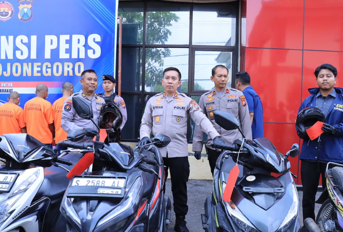 Kapolres Bojonegoro menjelaskan, lima orang tersangka telah diamankan karena diduga terlibat dalam serangkaian aksi pencurian sepeda motor di wilayah Bojonegoro. Mereka adalah TH (41), WI (42), FL (40), JS (29), dan G (38) yang seluruhnya berasal dari Lamongan dan Mojokerto.