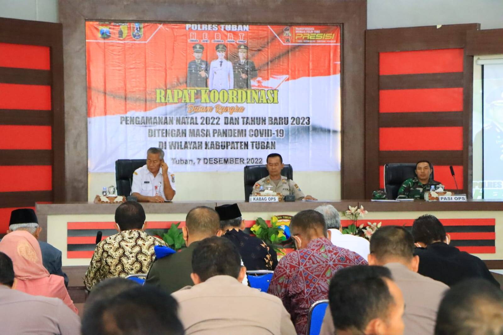 Jelang pelaksanaan perayaan Natal 2022 dan Tahun Baru 2023, Polres Tuban Polda Jawa timur menggelar rapat koordinasi (Rakor) kesiapan pengamanannya dengan Instansi terkait bertempat di gedung Sanika Satyawada Polres Tuban, Selasa (07/12/2022).