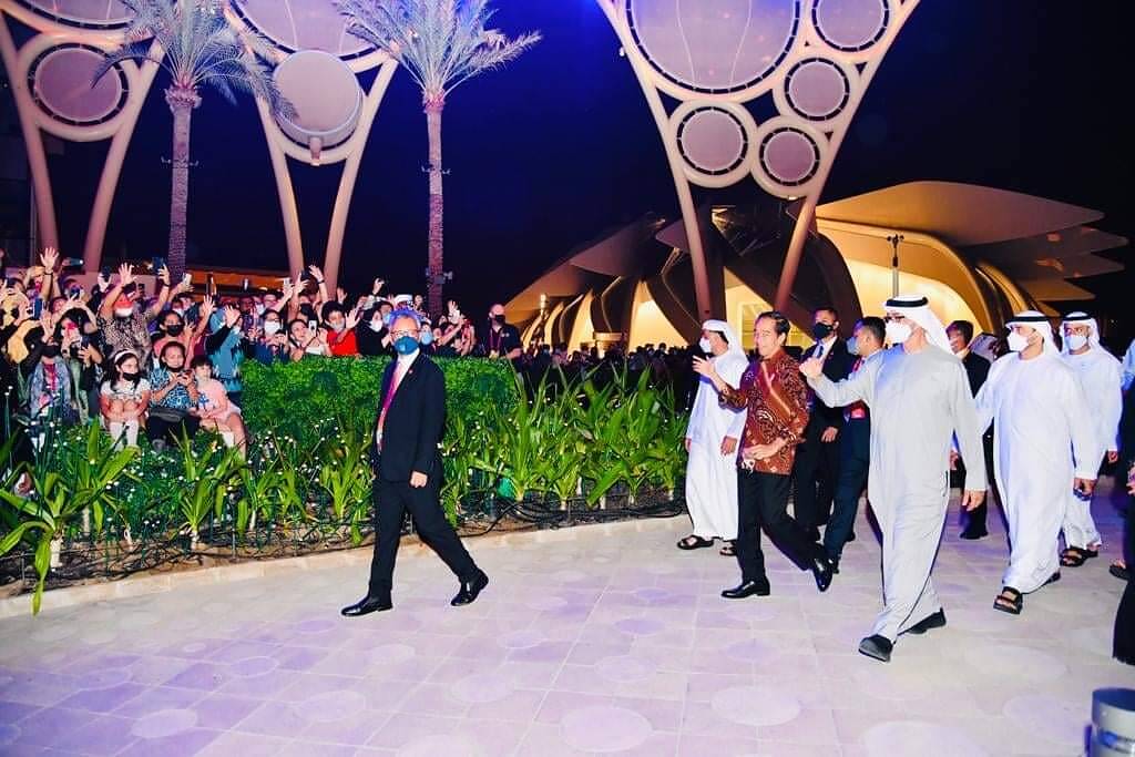Presiden Jokowi pun langsung menghampiri dan sempat berbincang-bincang. Tak hanya bertemu di paviliun PEA, Pangeran MBZ pun menemani Presiden Jokowi saat menyaksikan pertunjukan budaya di Al-Wasl.
