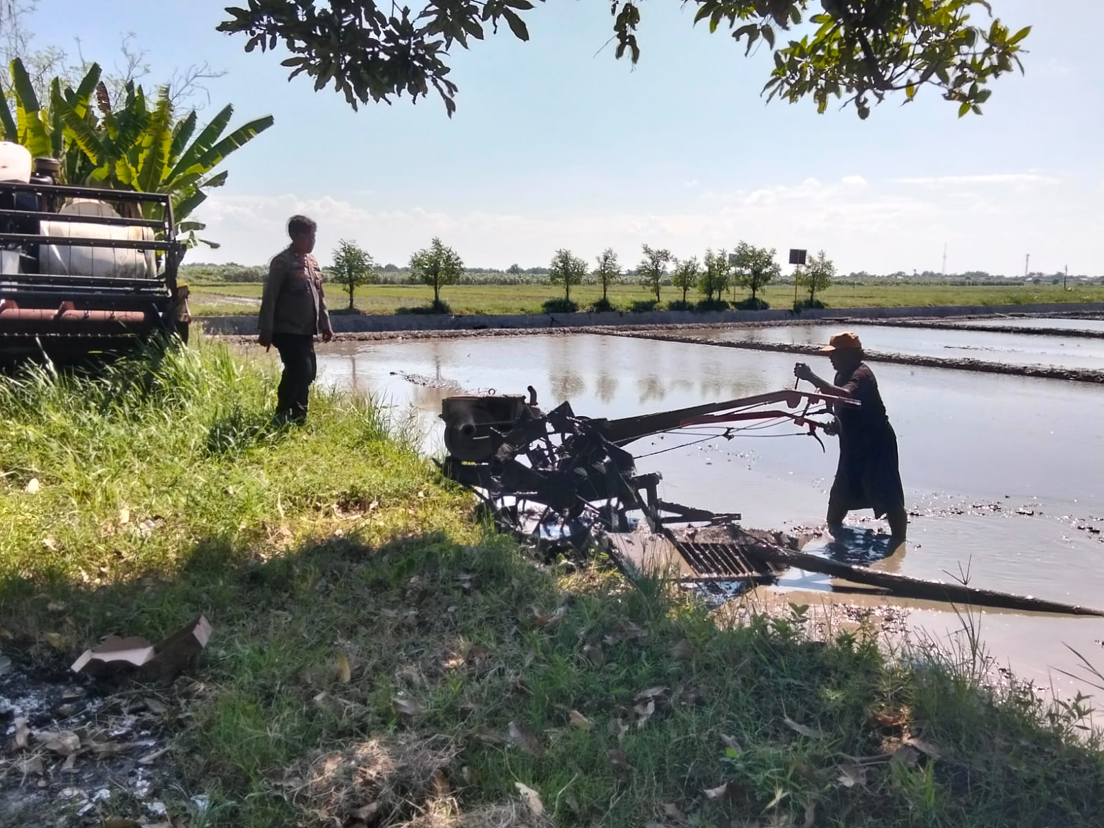 Polisi Cinta Petani, Kanit Binmas Polsek Prambon Dampingi Petani Bajak Sawah
