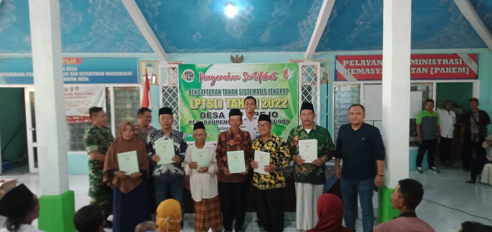 Bojonegoro, Kabar1News.com – Bersama Badan Pertanahan Nasional (BPN) Kabupaten Bojonegoro, Panitia Program Pendaftaran Tanah Sistematis Lengkap (PTSL) Desa Selorejo Kecamatan Baureno Kabupaten Bojonegoro Provinsi Jawa Timur membagikan (menyerahkan-red) Sertifikat program PTSL tahun 2022, di Balai Desa setempat, Jumat (06/1/2023) siang.