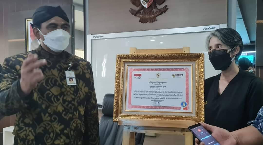 Penghargaan diserahkan Menteri PAN-RB, Tjahyo Kumolo kepada Wakil Gubernur Jawa Tengah, Taj Yasin Maimoen secara virtual, Selasa (9/11/2021).