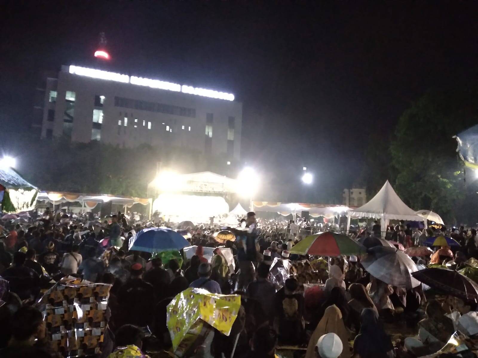 Meskipun diguyur hujan, semarak musik Kyai Kanjeng yang hadir bersama Emha Ainun Nadjib atau Cak Nun, tak mengurangi antusiasme warga.
