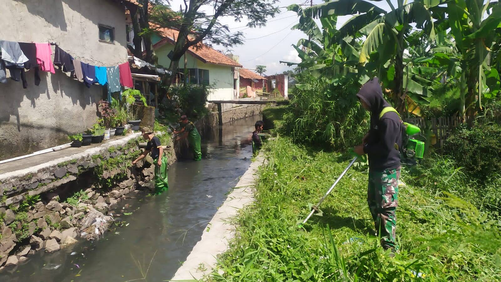 Terpantau di lokasi Satgas melakukan pembabatan rumput liar dengan menggunakan mesin pemotong rumput dan alat manual lainnya, kendati demikian Satgas tetap melakukan pembersihan secara maksimal sehingga sungai nampak bersih dan bantarannya menjadi rapi.