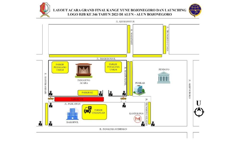 Lebih lanjut ia mengatakan, terkait kebutuhan area parkir, Jalan Pahlawan akan ditutup untuk diubah menjadi area parkir VIP, sementara parkir untuk undangan akan disediakan di halaman Bakorwil Bojonegoro. Bagi pengguna motor, akan diarahkan untuk memanfaatkan area parkir di sekitar alun-alun sisi selatan. Selain itu, pengunjung dapat memanfaatkan area parkir di sepanjang Jl. Hasyim Asyari, Jl. Imam Bonjol, Jl. Majapahit, dan Jl. Trunojoyo Utara.