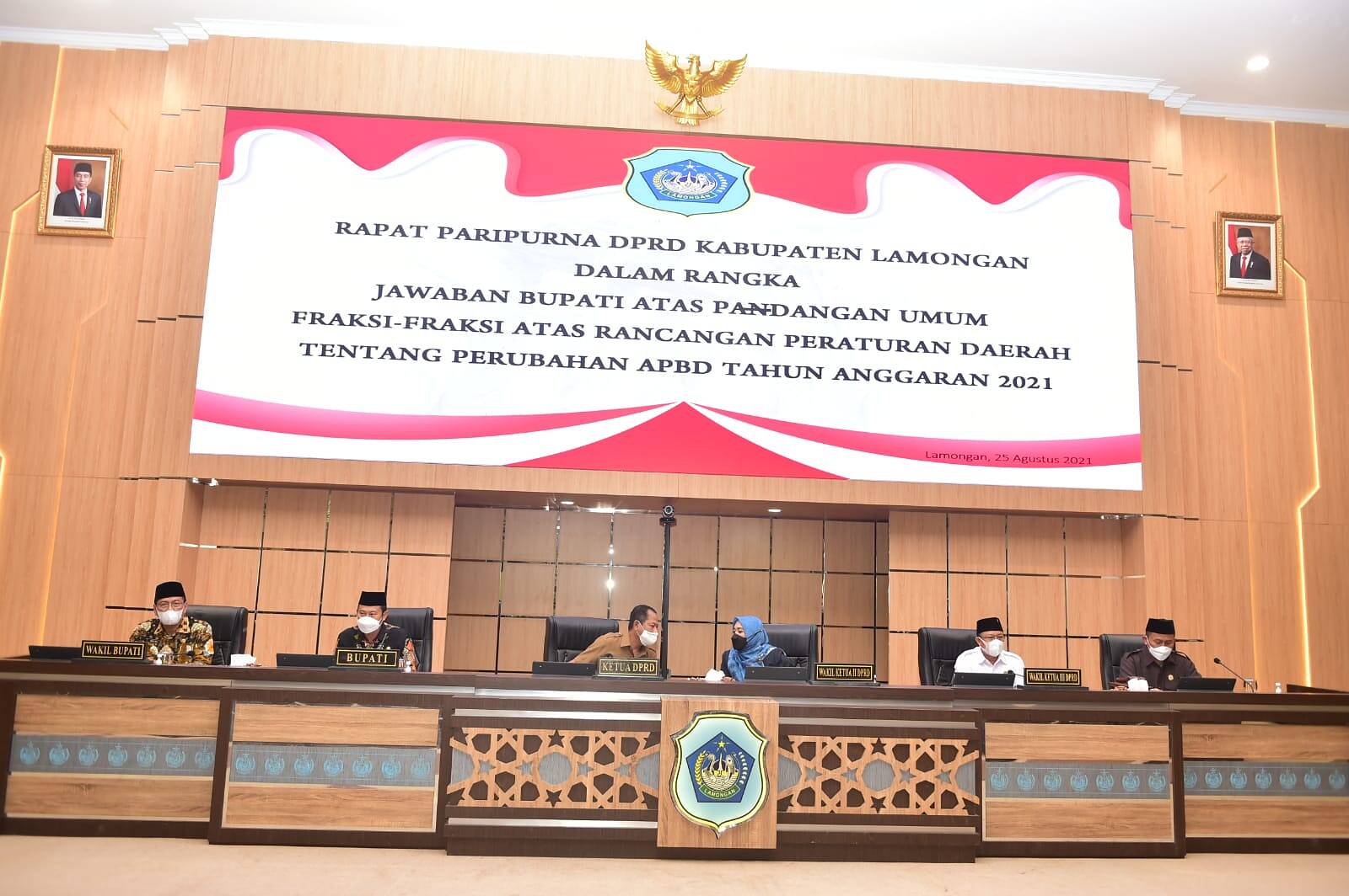 Lamongan,Kabar1News.com – Setelah sebelumnya disampaikan Pandangan Umum Fraksi-Fraksi atas Rancangan Perubahan Anggaran Pendapatan dan Belanja Daerah (APBD) Tahun 2021 Kabupaten Lamongan, kali ini, Rabu (25/8) giliran Bupati Yuhronur Efendi menyampaikan jawabannya terhadap pemandangan umum fraksi-fraksi pada rapat paripurna DPRD Kabupaten Lamongan di ruang rapat paripurna.